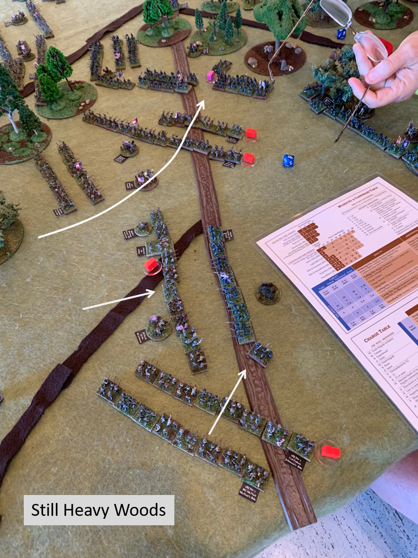 Here also we have the timeless debate; Is it better to deploy in the formation of field column or battle line when in the heavy woods. Field Column lets to you advance faster through the terrain but then you lose a turn redeploying into line in order to fight. Start in line and you advance slower, but at arrive ready to fight. One day I will sit down and do the math to see which is really better. I opted for field column because it seemed the thing to do, and I had to preserve the image of knowing what I was doing, because everyone else was deploying in columns.